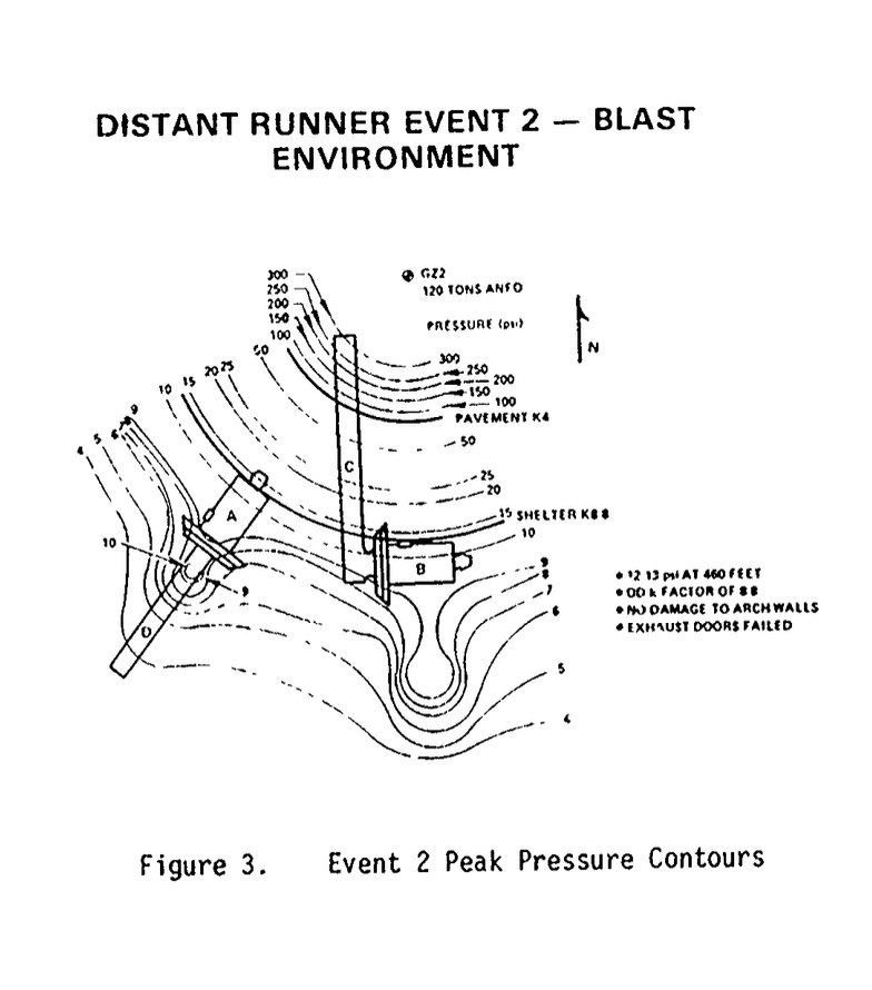 本研究对两座与美军及北约在欧洲基地使用的第三代加固机堡相同规格的建筑,进行了五次高爆测试(代号「DISTANT RUNNER」)。测试目的是收集足够的实验数据,为国防部爆炸物安全委员会(DDESB)修订机堡内部及周边常规弹药存储的数量-距离(QD)安全标准提供依据。前两次测试在机堡外部引爆 120 吨 ANFO 炸药(铵油炸药),而后三次测试则在机堡内部引爆 AIM-9 导弹弹头和 Mark-82 航弹。