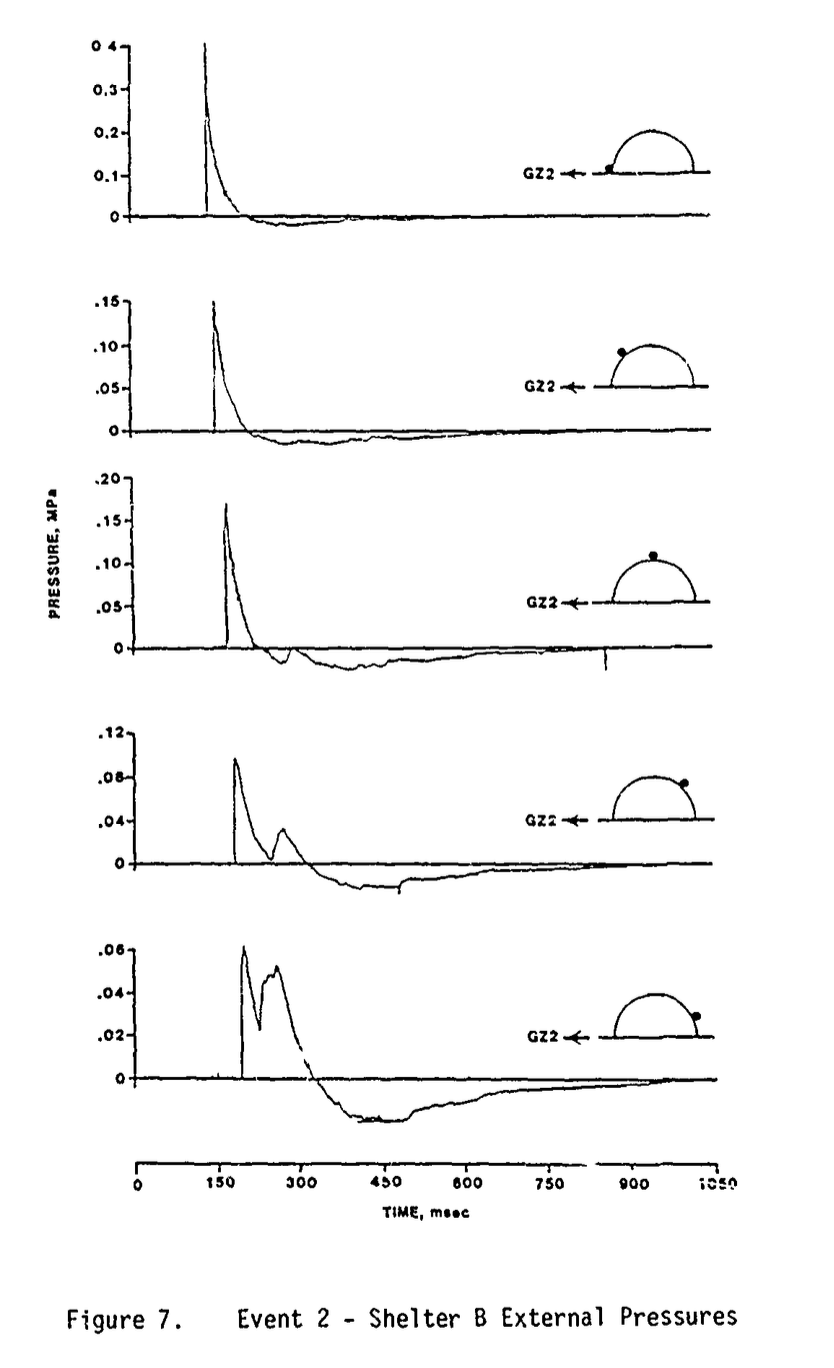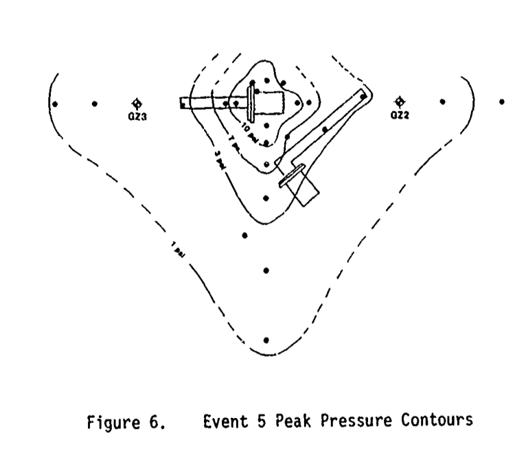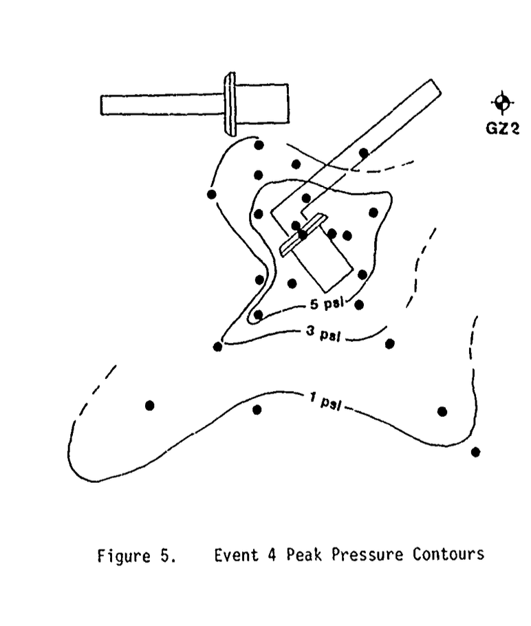 机堡内部测得的压力值普遍低于 1.6 psi。仅在侧向受爆机堡前门附近的一个角落测点记录到超过 8 psi 的压力值。该高压区呈现出明显的高度局部化特征,并在距离该测点仅 20 英尺处即迅速衰减,未对相邻测点产生影响。