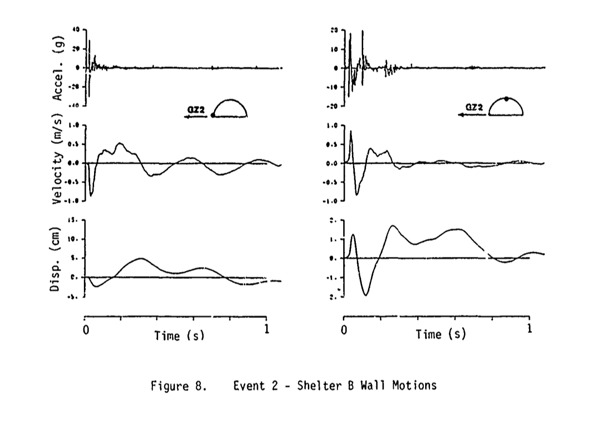 机堡后部遭受了极为严重的破坏,但整体位移仅为数英尺。前部门体被直接向前抛射,飞行距离约 400 英尺。高速摄像显示,门体在飞行过程中发生了前后翻滚运动。其中一扇前门最终掉落在另一座机堡旁,对该机堡侧面造成了轻微的表面损伤。